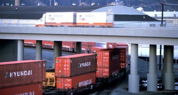 Photo: The Freight Action STrategy (FAST) freight corridor, seen here near Port of Tacoma, Washington, is a partnership of 26 local cities, counties, ports, federal, state and regional transportation agencies, railroads and trucking interests, intent on solving freight mobility problems with coordinated solutions. Image: AAPA