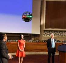 Unmanned Cowboys CTO Ben Loh and CEO Dyan Gibbens demonstrate their Atlas UAV at a Senate Aerospace Caucus luncheon. Photo: AIA