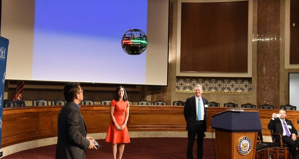 Unmanned Cowboys CTO Ben Loh and CEO Dyan Gibbens demonstrate their Atlas UAV at a Senate Aerospace Caucus luncheon. Photo: AIA