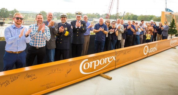 The ceremony began with opening remarks from Tom Banta, Managing Director of Corporex. Prior to the ceremony, local city and county officials, and members of the Corporex’s leadership team signed the beam before it was later put into place.