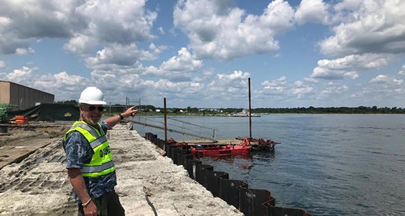 “You wouldn’t think that an oyster farm could work next to an industrial port like the Port of Davisville, but it does,” says Steven DePetrillo (left, pointing at location of his oyster farm), owner of Quonset-based Allen Harbor Oyster.